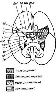 У той же час вона різко відрізняється від нової кори, так як і у дорослого представлена корковою платівкою одношарової або тільки з наміченим розшаруванням. До складу старої кори входять розташовані в глибині гиппокамповой борозни (рис. 1, fh) амонію ріг з дуже великими клітинами, разделяющийся на ряд полів (subiculum, сектори h1, h2, h3, h4, h5), і зубчаста фасція з досить густо - і дрібноклітинний корковою платівкою. До старої корі відноситься і характеризується досить редукованою корковою платівкою taenia tecta, що покриває зверху мозолисте тіло і переходить на основі мозку в медіальну нюхову звивину (рис. 1, gom).