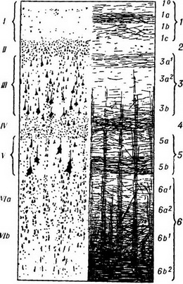 Рис. 2. Цито - і миелоархитектонические шари в області нової кори. Цитоархитектонические шари позначені римськими цифрами, а миелоархитектонические - арабськими. (Підшари 6b1 і 6b2 виділяються Фогтом як сьомий шар.) |
