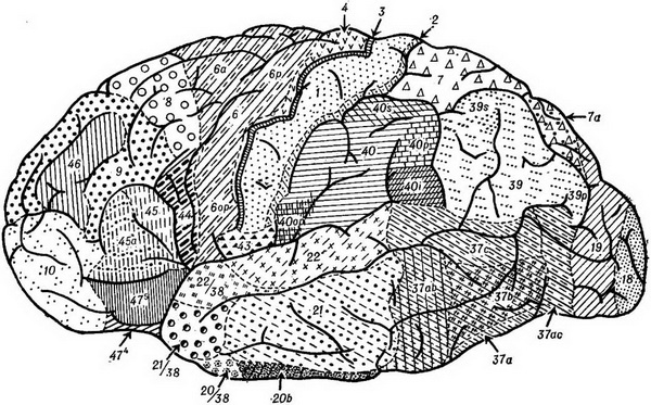 Рис. 3. Цитоархитектоническая карта кори великого мозку. Зовнішня поверхня півкулі.