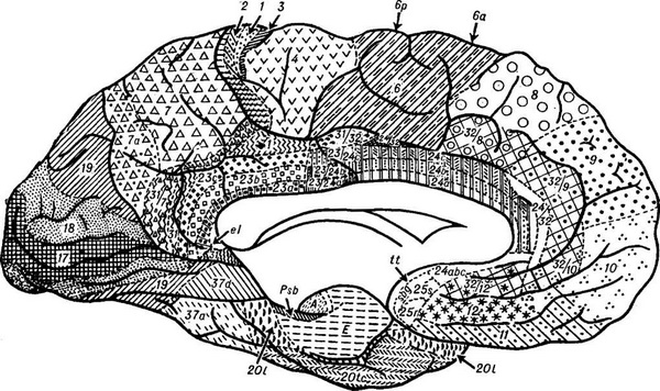 Рис. 4. Цитоархитектоническая карта кори великого мозку. Внутрішня поверхня півкулі.