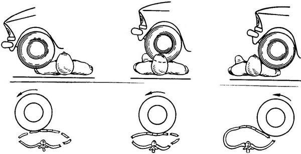 Травмування накочуються колесом тіла людини є складним динамічним процесом, який складається з ряду явищ. Первинне зіткнення колеса з тілом людини сприймається як удар твердим тупим предметом. Внаслідок обертання колеса (між ним і покриттям дороги) «затягуються» одяг і шкірні покриви. Натяг одягу призводить до її ушкодження (розриви в ділянці швів, відриви ґудзиків та ін), а на шкірі виникають полосчатиє осаднения і синці (в поперечному напрямку по відношенню до руху колеса) - «первинний щипок». В області «первинного щипка» можливо поява надривів епідермісу внаслідок перерозтягнення шкіри. Після цього починається процес накатування колеса, при якому як на одязі, так і на тілі виникають негативні відбитки малюнка протектора колеса (рис. 40). Механізм їх утворення наступний: в момент переїзду колесом ділянки шкіри стискаються найбільш виступаючими частинами протектора. Внаслідок здавлення судин кров переповнює ділянки шкіри, відповідні западаючим частинах протектора. У цих місцях виникають крововиливи. Пошкодження, що відображають западаючі частині протектора, прийнято називати негативним відбитком, а виступаючі - позитивним. Комплекс негативних і позитивних відбитків і становить в цілому малюнок протектора коліс автомобіля, що може служити цілям ідентифікації конкретного протектора (рис. 41).