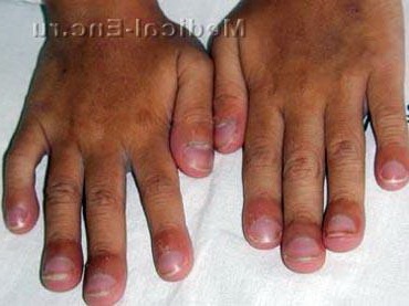 Барабанні пальці - колбовидное розширення кінцевих фаланг пальців, обумовлене потовщенням м'яких тканин і деформацією нігтів (рис.). Початковим проявом симптому є зміна нігтів у виді годинних стекол. Патогенез невідомий; мабуть, грають роль нейротрофічні порушення (симетричність ураження). Спостерігається при вроджених вадах серця, затяжному септичному ендокардиті, абсцесі легені, бронхоектазах, кавернозному туберкульозі легень.
