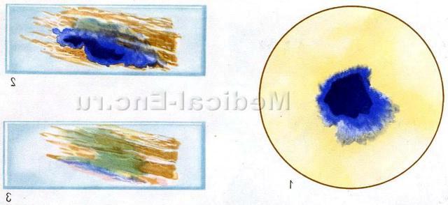 Кал наносять тонким шаром на предметне скло і додають до нього кілька крапель бензидинового реактиву. При наявності крові в калі з'являється відповідне забарвлення (рис. 2 і 3).