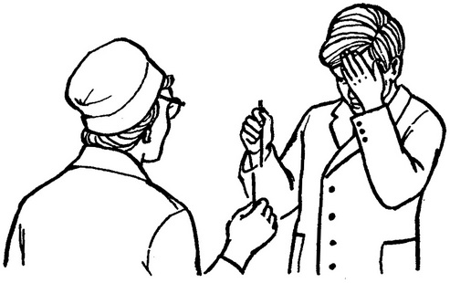 Достатньо просто визначити наявність бінокулярного зору і наступним способом. Беруть дві довгі тонкі палички (рис. 28). Одну з них медична сестра тримає вертикально перед обстежуваним. Останній повинен, дивлячись двома очима, інший паличкою зверху вниз доторкнутися до кінця палички. Якщо він це робить швидко, без праці, бінокулярний зір у нього збережено. При відсутності глибинного зору обстежуваний цього зробити не зможе як при погляді двома очима, так і закривши одне око.