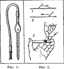 ![]() Рис. 1. Змішувач для еритроцитів. Рис. 2. Послідовні етапи (1-3) приготування мазка крові. Стрілки вказують напрямок руху скла.  |