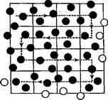 ![]() Рис.3. Схема підрахунку еритроцитів у великому квадраті. Пунктир зі стрілкою вказує порядок пересування по малих квадратах (в рахунок включають тільки еритроцити, зафарбовані чорним). |