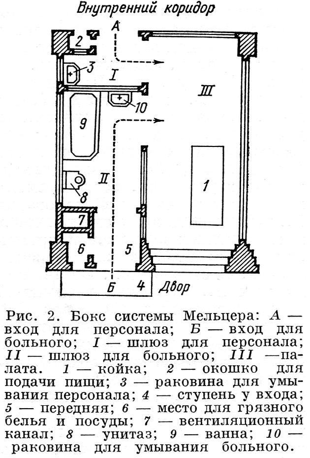 Найбільш досконалі індивідуальні (так звані мельцерівські) бокси (рис. 2). Хворий в такому боксі повністю ізольований. Надходить він у бокси з двору. У такому боксі також є відділення - шлюз, сполучені з коридором боксированных відділень, в якому знаходиться умивальник, другий халат, косинка (ковпак).