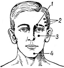 ![]() Рис. 1. Больові точки при невралгії трійчастого нерва і мігрені: 1, 3 та 4 - виходи гілок трійчастого нерва; 2 - проекція зовнішніх скроневих, артерій.  |