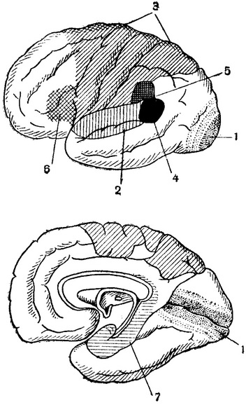 1 - зорова зона; 2 - слухова; 3 - чутливо-рухова; 4 - зоровий центр мовлення; 5 - слуховий центр мовлення; 6 - руховий центр мовлення; 7 - нюхова зона