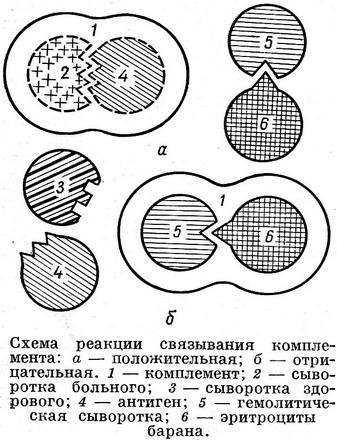 Якщо комплемент фіксувався імунною системою, гемолізу не відбувається (позитивна РСК; рис., а); якщо ж імунна система не фіксувала комплемент і її компоненти не відповідають один одному, гемоліз відбувається (негативна РСК; рис., б). Інгредієнти реакції: 1) випробувана сироватка, інактивована прогріванням протягом 30 хв. при t° 56°; 2) антиген (суспензії бактерій, екстракти органів і тканин, віруси); 3) комплемент (свіжа сироватка морської свинки); 4) гемолітична система (сенсибілізовані еритроцити барана, инкубированные з гемолітичною сироваткою протягом 30 хв. при t° 37°). Для розведення інгредієнтів використовують ізотонічний розчин хлориду натрію. Перший етап РСК триває 60 хв. при t° 37° або 18-20 год. при t° 4-6° (більш чутлива РСК), другий етап - 60 хв. при t° 37°.