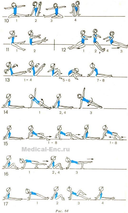 12. І. п. сидячи, шкарпетки на себе, руки вперед. Перенести прямі ноги вліво, шкарпетки витягнути, руки відвести вліво. Повернутися в в. п. Те ж в іншу сторону.