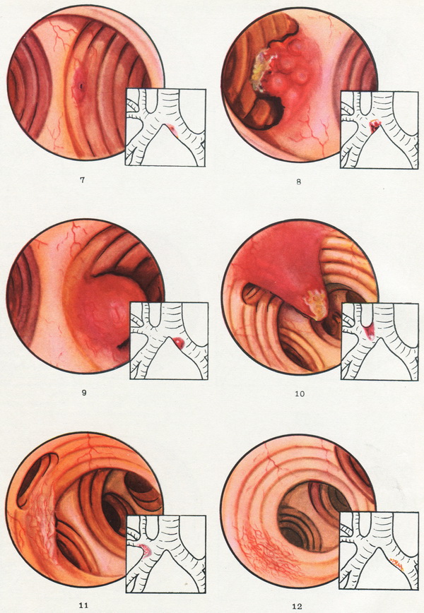 Рис. 7. Бронхо-лімфатичний свищ лівого головного бронха. Рис. 8. Бронхо-лімфатичний продуктивний нориця з грануляціями і казеозом на правій стінці біфуркації трахеї. Рис. 9, Бронхо-лімфатичний продуктивний інфільтрат (поліповідний) лівого головного бронха. Рис. 10. Бронхо-лімфатичний ексудативний інфільтрат (у вигляді фурункула з казеозом на верхівці) над гирлом правого верхнедолевого бронха; стеноз III ступеня. Рис. 11. Фіброзне ущільнення слизової оболонки з поверхневим рубцюванням нижньої стінки гирла правої верхнедолевого бронха і зовнішньої стінки правого головного бронха. Рис. 12. Инъецированная капілярна мережа судин внутрішньої стінки лівого головного бронха.