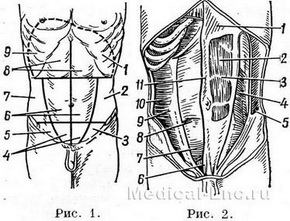 Анатомічно передньо-боковий відділ черевної стінки складається з трьох шарів. Поверхневий шар включає шкіру, підшкірну клітковину, поверхневу фасцію. Середній м'язовий шар в медіальному відділі складається з прямих і пірамідальних м'язів живота, в латеральному - з двох косих (зовнішньої і внутрішньої) і поперечної м'язів (рис. 2). Ці м'язи разом з грудо-черевної перешкодою, діафрагмою тазу і м'язами заднього відділу черевної стінки утворюють черевний прес, основною функцією якого є утримання органів живота в певному положенні. Крім того, скорочення м'язів черевного преса забезпечує акти сечовипускання, дефекації, пологів; ці м'язи беруть участь у дихальних, блювотних рухах тощо Косий і поперечний м'язи живота спереду переходять в апоневрози, які утворюють піхву прямого м'яза живота і, з'єднуючись по середній лінії, білу лінію живота. Місце переходу м'язових пучків поперечної м'язи в сухожильні являє опуклу назовні лінію, звану напівмісячної. Задня стінка піхви прямого м'яза живота закінчується нижче пупка дугоподібною лінією.