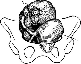 Рис. 39. Обмеження вагітної матки в малому тазі пухлиною яєчника. 1 - вагітна матка; 2 - пухлина яєчника.