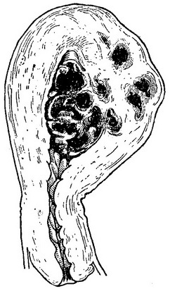 Макроскопічно хоріонепітеліома (рис. 43) подається або у вигляді окремих вузлів, більш або менш вдаються в порожнину матки, або у вигляді дифузних розростань в товщі маткової стінки (атипова форма>. Пухлина буває величиною від горошини до кулака. А. Е. Мандельштам наводить випадок, де пухлина була завбільшки з голову дорослого. У тому і іншому випадку тканина пухлини відрізняється рихлістю, просякнута кров'ю, з периферії відзначається схильність до розпаду і нагноєння. Кровоточивість тканини хоріонепітеліоми настільки велика, що нерідко її вузли макроскопічно можна прийняти за геморагічні фокуси.