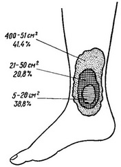 Площа трофічних виразок від 5 см2 до 20 см2 спостерігалася у 479 хворих (38,8%), від 21 см2 по 50 см2 - у 257 (20,8%), від 51 см2 до 400 см2 і більше - у 498 (41,4%) (рис. 3). Отже, у більшості хворих (62,2%) виразки були великих розмірів. Кількість виразок поступово зменшується до площі 50 см2, потім спостерігається збільшення площі ураження та кількості хворих. Це пояснюється характером їх загоєння, оскільки при лікуванні таких виразок у центрі затримується епітелізація величиною в 3-копійчану монету. Виразки площею більше 50 см2 мають малу тенденцію до загоєнню. Це свідчить про малу ефективність консервативних способів лікування при давності виразкового процесу.