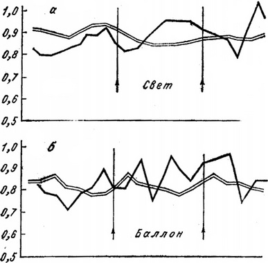 Рис. 38. Коливання тривалості циклів RR за даними електрокардіографії у відповідь на застосування світлового подразнення (а), роздування балончика в піхву (б). Однією рисою - до сеансу анодической гальванізації, двома рисами - після сеансу. По осі ординат - час в частках секунди.