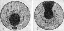 ![]() Колобома райдужної оболонки: 1 - вроджена; 2 - післяопераційна. |