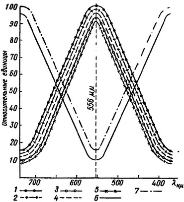 Рис. 1. Схематичні криві: 1 - яскравості у спектрі; 2 - видности в спектрі; 3 - адиспаропии (тимчасового зниження цветоразличения); 4 - функціональної стійкості в спектрі; 5 - електричної активності; 6 - насиченості в спектрі; 7 - колірного стомлення в спектрі. |