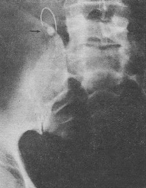 У трьох хворих спостерігався обрив петлі (рис. 11). Це змусило нас провести оперативне видалення каменя і обірваній частині петлі у одного хворого; друга хвора відмовилася від операції і виписалася додому. Через місяць у неї самостійно відійшов обривок петлі. У третього хворого на другий день обривок петлі і камінь були видалені петлею типу Девіса шляхом одноразової тракції.