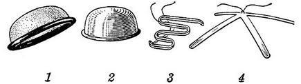Апробовані і почали застосовувати механічні внутрішньоматкові засоби, що виготовлюються із пластичних синтетичних матеріалів, - «пружинки» і «парасольки» (рис., 3 і 4). Застосування їх може бути рекомендовано жінкам при відсутності яких-небудь органічних та функціональних захворювань статевої сфери. Введення цих коштів в матку здійснюється обов'язково лікарем-гінекологом через спеціальну трубку-провідник. Обов'язковою умовою є наявність I - II ступеня чистоти піхви і нормальна картина крові. Внутрішньоматкові засоби при строгому дотриманні показань, протипоказань та умов їх застосування дають хороший протизаплідний ефект і не порушують статевого життя подружжя. Пружинка при необхідності може бути легко видалена з матки.