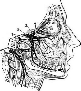 Рис. 3. Топографія лицьового нерва: 1 - скронева гілка лицьового нерва; 2 - скуловые гілки лицьового нерва; 3 - щічні гілка лицьового нерва; 4 - протока близько-вушної залози; 5 - привушна залоза; 6 - зовнішній слуховий прохід; 7 - лицевий нерв; 8 - крайова гілка лицьового нерва; 9 - шийна гілка лицьового нерва. |