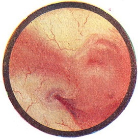 Устя сечоводів мають щілиноподібну форму. У цистоскоп можна бачити їх періодичні розширення, що супроводжуються викиданням цівки сечі, безбарвною в нормі, пофарбованої в червоний колір при ниркових кровотечах (рис. 33), синій - при индигокарминовой пробі (рис. 34).