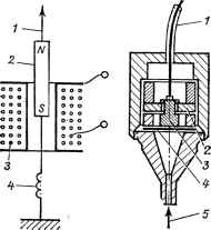![]() Рис. 2. Схема електродинамічного сенсора: 1 - тяга; 2 - рухомий магніт; 3 - індукційна котушка; 4 - керуюча пружина. Рис. 3. Схема ємнісного датчика Хансена: 1 - вихідний кабель; 2 - ізоляція; 3 - нерухома пластина конденсатора; 4 - рухома пластина конденсатора; 5 - місце прикладання тиску |