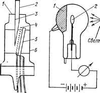 ![]() Рис. 4. Схема механоэлектронного датчика (механотрон): 1 - гнучка металева діафрагма; 2 - стрижень; 3 - рухливий анод; 4 - сітка; 5 - катод; 6 - металева оболонка, поєднана з анодом. Рис. 5. Схема фотоелектричного датчика: 1 - фотокатод; 2 - анод |
