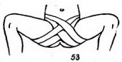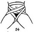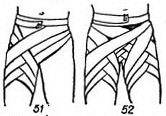 Пов'язки на промежину. Зазвичай достатньо Т-подібної пов'язки (мал. 27) або пов'язки на обидві пахові області, але краще зробити перед накладенням восьмиобразного ходи навколо стегон (мал. 53). Більш складна пов'язка - з ходами бинта, перехресними на промежини (мал. 54).