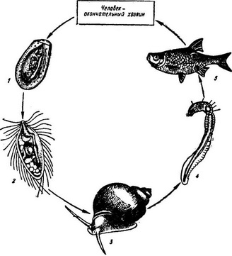 1 - виділене яйце описторхиса з личинкою; 2 - личинка, що вийшла з яйця в тілі молюска битинии, першого проміжного хазяїна (3); 4 - личинка, яка закінчила розвиток у молюска і здатна проникати в тіло риби; 5 - через м'ясо коропових риб може відбуватися зараження людини.