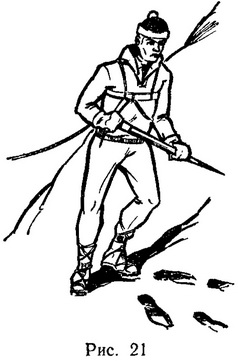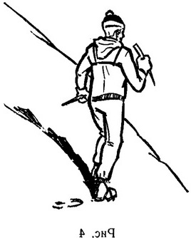 На підйомах, спусках, перетині крутих схилів альпеншток, льодоруб треба взяти напоготові. Для цього найближча до схилу рука охоплює держак в 20-25 см від кінця штычка, а інша тримає біля верхнього кінця держака, охоплюючи його з-під низу (рис. 4). Штычок повинен бути звернений у бік схилу. Для цього при підйомах треба рухатися або прямо вгору, злегка боком до схилу, або навскоси вгору.