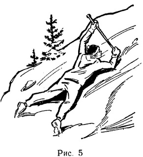 При падінні на сніжному схилі необхідно негайно після зриву, поки що невелика швидкість ковзання, застосувати прийом самозадержания. При падінні в будь-якому положенні - боком, на спину, головою вниз - треба насамперед різким ривком перевернутися на груди, головою вгору і, розкинувши ширше ноги, впираючись ступнями в схил, спробувати загальмувати рух. Гальмувати дзьобом льодоруба, налягаючи грудьми на держак і намагаючись не пошкодити рук про фірн та лід (рис. 5). Гальмування ведеться до повної зупинки.