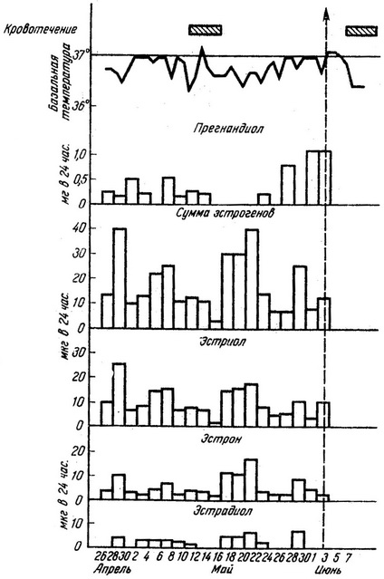 У першу половину дослідження (26/IV-11/V) спостерігався пік підвищення всіх трьох фракцій естрогенів (28 - 30/IV) (рис. 17). В цей час кольпоцитограммы вказували на різко виражені проліферативні зміни піхвового епітелію. Після піку естрогенів кількість естрогенів різко знизилося до 9,9 мкг на добу і кровотеча почалася на 12-й день від цього піку.