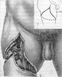 ![]() Рис. 3. Екзартікуляція стегна по Фарабефу: 1 - розріз шкіри; 2 - оголення стегнових судин для їх перев'язки. Початок розсічення м'язів. |