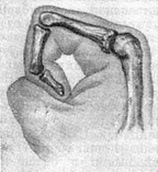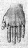 Екзартікуляція фаланг пальців. Знеболення місцеве (за Оберстом - Лукашевичем або круговий біля основи пальця). Кисть в положенні пронації. Асистент згинає і захищає сусідні пальці. Оперуючий захоплює удаляемую фалангу, різко згинає її і фалангеальным вузьким ножем або скальпелем з тильного боку розсікає м'які тканини точно над суглобової щілиною. Остання розташована дистальніше вершини цього суглоба: для нігтьової фаланги на 2 мм, для середньої - на 4 мм і для основної - на 8 мм (рис. 1). Після перетину бічних зв'язок скальпель вводять в суглоб; суглобову поверхню видаляється фаланги вывихивают в рану. Решту суглобової сумки з волярной сторони перетинають, після чого скальпель встановлюють паралельно фаланзі вістрям у дистальну бік і, притискаючи його до кістки, викроюють ладонный клапоть м'яких тканин. Залишки суглобової капсули січуть ножицями. Клапоть фіксують кількома вузловими швами. Лігувати судини зазвичай не доводиться.