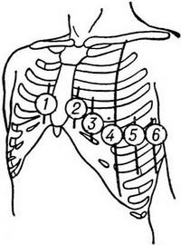 ![]() Рис. 1. Розташування електродів при реєстрації передніх грудних відведень (зазначено цифрами відповідними їх порядковим 1 номерами). Вертикальні смуги, що перетинають цифри, що відповідають анатомічним лініях: 1 - правою грудинной; 2 - лівої грудинной; 3 - лівої окологрудинной; 4-лівої среднеключичной; 5-лівій передній пахвовій; 6 - лівої середньої пахвової.  |