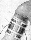Рис. 3. Розташування електродів при викликанні загального іонного рефлексу: 1 і 2 - свинцеві пластинки з тканинними прокладками; 3 - ізольований провід; 4 - гумовий бинт. |