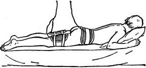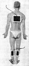 Іонні поясу (кальцієвий, бромистий, йодистий, магнієвий та ін). На рівні нижніх грудних і верхніх поперекових хребців (при верхньому поясі) або на рівні нижніх поперекових і крижових хребців (при нижньому поясі) накладають три шари фільтрувального паперу або марлі площею 1125 см2 (15X75 см), змоченою в 50 мл розчину лікарської речовини, приготовленого на дистильованій воді (t° 38-39°). Зверху розташовують прокладку такої ж площі товщиною 1 м і металевий електрод. Два індиферентних електроди з прокладками площею 320 см2 кожна розташовують на передній поверхні верхньої третини стегон при верхньому поясі або на задній поверхні стегон при нижньому поясі (рис. 5). Струм від 8 до 15 мА, тривалість процедури 8-10 хв, при необхідності її збільшують до 15-20 хв.