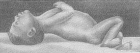 ![]() Рис. 3. Ригідність м'язів потилиці і закидання голови при епідемічному цереброспинальном менінгіті. |