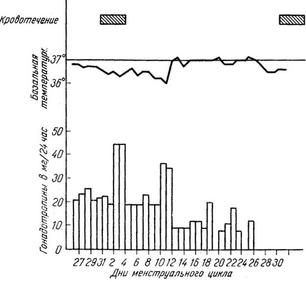 Нами у 3 здорових дівчат у віці 17-18 років був встановлений аналогічний характер екскреції загальних гонадотропінів з сечею (для дослідження був використаний метод Деканского в модифікації Р. С. Степанова). Більше гонадотропінів виділялося на початку і середина менструального циклу, утворюючи два чітко виражених піку. Початковий пік гонадотропінів виявлявся або в останній день попереднього або в перші 4 дня наступного менструального циклу. Овуляционный пік у однієї хворої збіглося зі зниженням базальної температури, а у 2 хворих передував зміни базальної температури або слідував за нею.