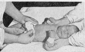 На пуповину, змащену йодом, 2% спиртовим розчином стрептоциду або 5% розчином марганцевокислого калію, накладається стерильна марлева пов'язка, що складається з двох квадратних марлевих серветок з довжиною сторони 10-12 див. Перший шматочок марлі накладається безпосередньо на пуповину (рис. 102 і 103), а другий складається трикутником і у вигляді косинки зав'язується вузлом на кордоні між пупковим кільцем і залишком самого пупкового канатика. Треба стежити, щоб вузол був туго затягнутий у самого шкірного кільця, але щоб він не захоплював шкіру. Окремі етапи перев'язки видно з рис. 104 і 105.