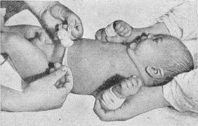 У перші 2-3 дні дитину сповивають з ручками, а голову покривають краєм теплої пелюшки; недоношених і слабонароджених дітей сповивають так, протягом перших 3-4 тижнів, а іноді й довше (рис. 99). З 3-4-го дня життя, якщо в палаті досить тепло (22°), доношених здорових дітей загортають у обидві пелюшки, починаючи приблизно від пахвових западин, але так, щоб ручки залишалися вільними (рис. 100). У такому вигляді їх кладуть у ліжечка і покривають зверху одеяльцами.