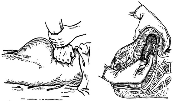 До ручного обстеження порожнини матки готуватися треба так само, як і до ручного відділення плаценти. У той час, поки оперує готує руки, хтось інший повинен зробити ще одну спробу зупинки кровотечі шляхом притиснення черевної аорти. Для цього треба встати збоку від породіллі і пальцями обох рук, розташовуючи руки одну над іншою, притиснути черевну частину аорти до хребта. Це можна здійснити й кулаком правої руки (рис. 38). При цьому зменшується приплив крові до матки і у відповідь на анемізації матка скорочується.