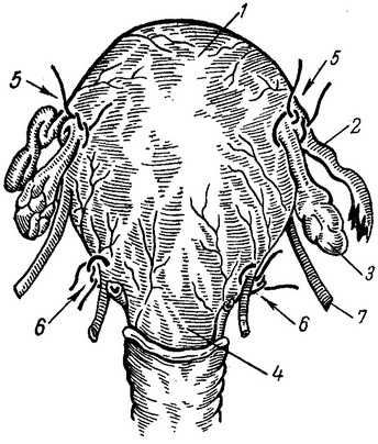 1 - тіло матки, 2 - маткова труба. 3 - яєчник, 4 - шийка матки, 5 - лігатура, накладена на власну зв'язку яєчника, 6 - лігатура, накладена на маткову артерію, 7 - кругла маткова зв'язка.