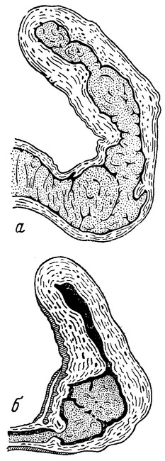 41. Тампонування матки, а - правильне; б - неправильне.