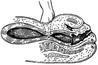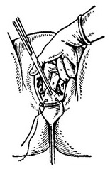 Шов по Лосицкой накладається на задню губу шийки матки. Для цього шийка оголюється за допомогою піхвових дзеркал. На задню губу шийки матки накладаються кульові щипці, за які шийка відтягується до лона. В цервікальний канал вводяться два пальці (вказівний і середній) лівої руки, якими злегка випинається задня стінка шийки матки. З боку заднього склепіння піхви зліва від середньої лінії великий голкою, зарядженої товстим кетгутом, проколюється задня стінка шийки матки з выколом в цервікальний канал. Потім, на відстані 3-4 см від місця выкола, голка проводиться у зворотному напрямку - із цервікального каналу в задній піхвовий звід праворуч від середньої лінії. Кетгут зав'язується і зрізається (рис. 42). В результаті на задній губі шийки матки утворюється поздовжня складка. Накладена лігатура надає механічне подразнення тієї зони шийки матки, де є велика кількість нервових закінчень. В результаті цього подразнення рефлекторно викликається скорочення матки.