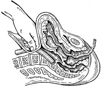 З інших методів застосовується притиснення низхідній аорти до хребту через зовнішні черевні покриви за допомогою пальців або спеціальних приладів (рис. 109). Мета цього способу - досягти припинення припливу крові до матки (артеріальна анемія), щоб викликати інтенсивні скорочення останньої. Однак цей метод не завжди успішний в силу того, що a. spermatica починається вище місця притиснення (майже на рівні відходження a. renales з аорти або з самої a. renales) і не піддається впливу. Крім того, успішність цього способу зменшується труднощами промацування аорти і достатнього для зупинки кровотечі здавлювання її (розтягнута матка, товста і пружна черевна стінка тощо).