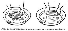 . Намокання бинта визначають за припинення виділення бульбашок повітря. Виймають бинт, захопивши з обох кінців так, щоб гіпс не витікав. Зближуючи руки, віджимають зайву воду.