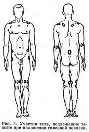 Гіпсові пов'язки накладають без підкладки безпосередньо на шкіру, прикриваючи кісткові виступи спеціальними ватяними подушечками (рис. 3)
